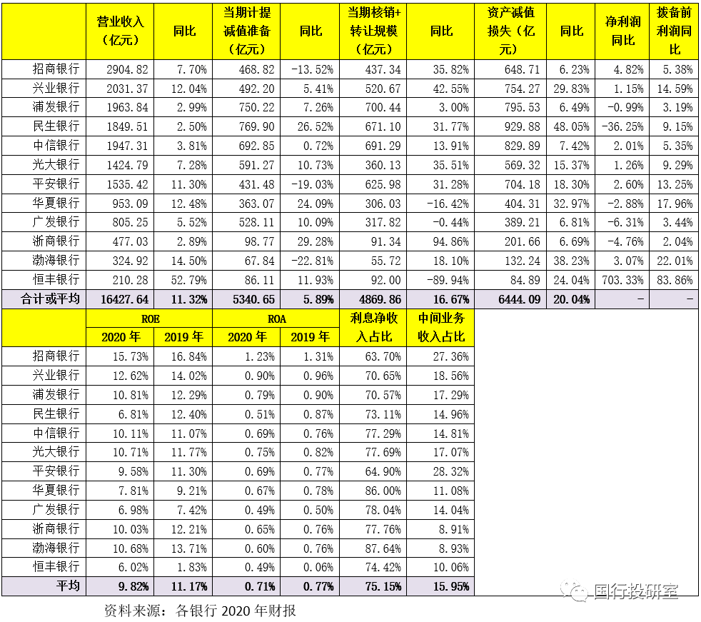 2020年12家股份行的ROE和ROA平均分別為9.82%和0.71%。其中,ROE較高的銀行主要有招行(15.73%)、興業(yè)銀行(12.62%)、浦發(fā)銀行(10.81%)、光大銀行(10.71%)、渤海銀行(10.68%),ROE較低的銀行主要有恒豐銀行(6.02%)、民生銀行(6.81%)、廣發(fā)銀行(6.98%)和華夏銀行(7.81%)。