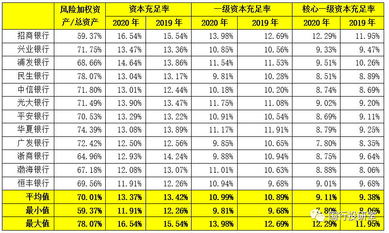 1、從風(fēng)險加權(quán)資產(chǎn)占比來看,12家股份行的平均值為70%,招行低至59.37%,表明其經(jīng)營最為輕型,浙商銀行、渤海銀行、浦發(fā)銀行、恒豐銀行亦均比較低。但民生銀行(78.07%)、華夏銀行(74.39%)相對比較高。