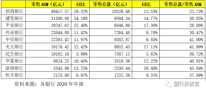 實際上除前面討論的那些指標(biāo)外,股份行的零售AUM(包括零售存款、零售理財、零售代銷等)可能是最為分化的一類指標(biāo),這一指標(biāo)能夠體現(xiàn)出一家銀行的零售綜合金融服務(wù)能力,即對零售客戶尋找可投資資產(chǎn)的能力。