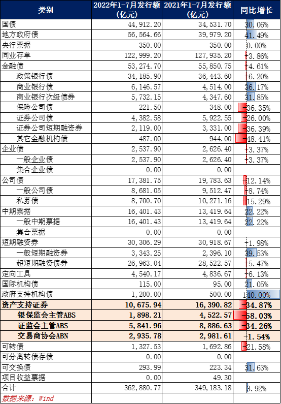 20221-7月份,我國資產證券化產品發行規模為10676億元,同步增長-34.87%。其中銀保監會主管ABS發行規模為1898億元,同比增長-58.03%;證監會主管ABS發行規模為5842億元,同比增長-34.26%;交易商協會ABN發行規模為2936億元,同比增長-1.54%