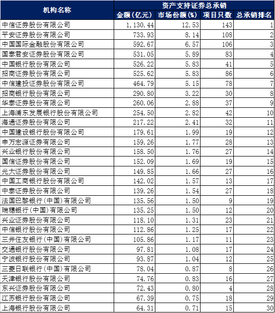 2022年1-7月份,全市場ABS總承銷排名靠前的機構分別為中信證券、平安證券、中金公司、國泰君安和中國銀行,承銷規模分別為1,130.44億元、733.93億元、592.67億元、531.05億元和526.22億元。