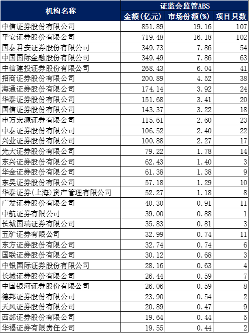 20221-7月份,證監會主管ABS承銷排名靠前的機構分別為中信證券、平安證券、國泰君安、中金公司和中信建投,承銷金額分別為851.89億元、719.48億元、349.73億元、349.49億元和268.43億元。前五大、前十大和前二十大承銷商市場份額占比分別為57.09%74.76%89.04%