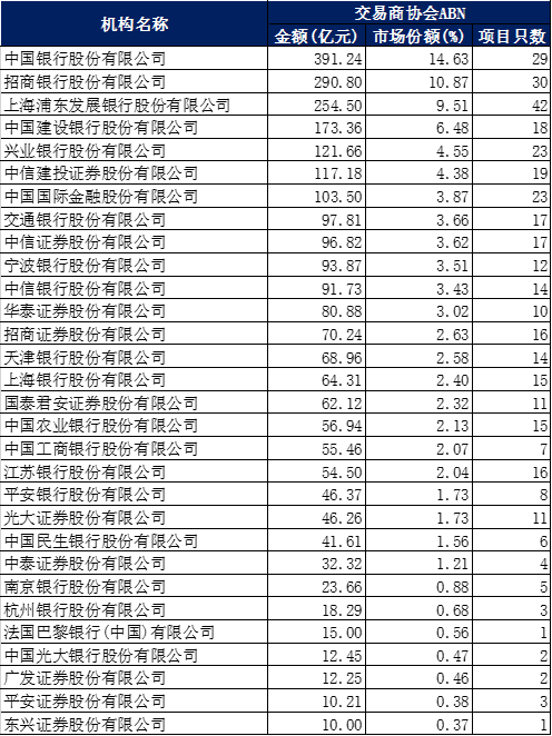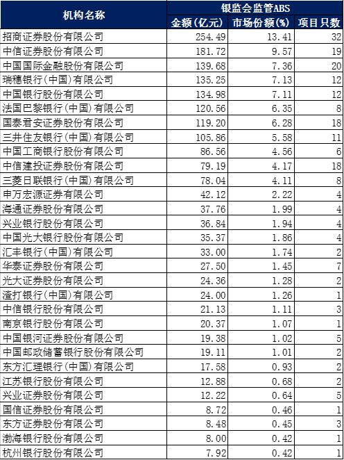 20221-7月份,銀保監會主管ABS承銷排名靠前的機構分別為招商證券、中信證券、中金公司、瑞穗銀行和中國銀行,承銷金額分別為254.49億元、181.72億元、139.68億元、135.25億元和134.98億元。前五大、前十大和前二十大承銷商市場份額占比分別為44. 57%71.51%90.49%
