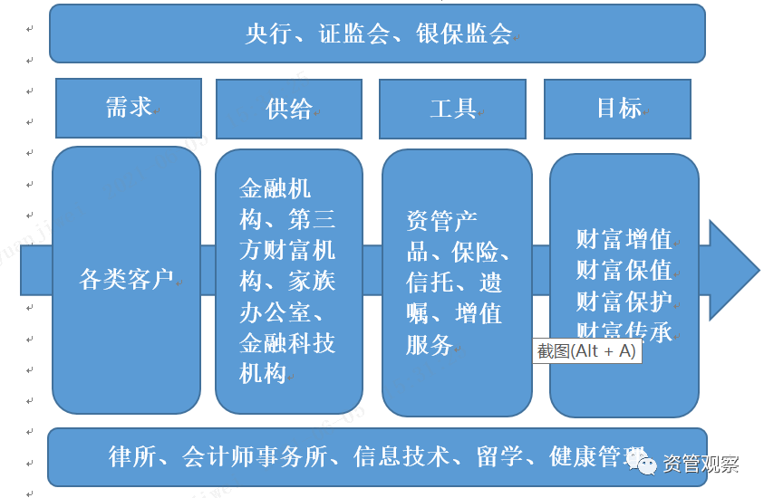 雖然在金融領域,有關財富管理和資產管理的話題很多,包括以財富管理為主題的各種論壇,但是現實中不同人對于財富管理有不同的理解,至少一個普遍的傾向是財富管理與資產管理經常混淆,或者將二者等同。與資管業務的理解、監管相比,財富管理是一個更加模糊的詞語和領域,但是其內涵要遠大于資產管理這是毋庸置疑的。從根本上看,財富管理是滿足個人客戶的資產和負債管理需求,為其提供的投資、債務、保險、養老、遺產繼承、稅收籌劃等方面的金融產品和服務、解決方案以及非金融服務。由此可見,資產管理是財富管理的重要組成部分,但是卻不是其全部。從目標上來看,資產管理更多是實現客戶的資產保值增值,而財富管理更多致力于滿足不同生命周期的生活目標;資產管理更多是以銷售各類資管產品和服務為宗旨,而財富管理更多是以為客戶提供個性化綜合金融解決方案為宗旨。