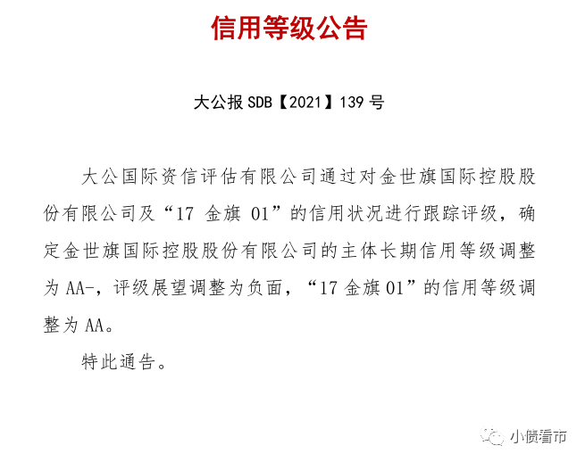 8月31日,大公國際將金世旗國際控股股份有限公司(以下簡稱“金世旗控股”)的主體長期債務評級從AA下調至AA-,評級展望調整為負面,“17金旗01”信用等級調整為AA。
