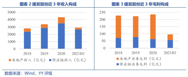 作為一家“供應鏈+地產”雙主業經營的企業,建發股份左手有供應鏈業務提供的穩定現金流,右手有地產開發帶來的高額利潤,兩大業務在盈利與現金流方面實現了一定程度的協同互補。從經營層面來看,供應鏈業務在國內持續領先(2020年排名第三),規模優勢顯著,盈利能力位于行業中上游,周轉能力較低,基本面保持穩定;地產業務近3年才實現突飛猛進的增長。從資金流向來看,建發股份的地產業務負債端資金偏長期,供應鏈業務負債端偏短期,與各自的業務特征匹配度較高。