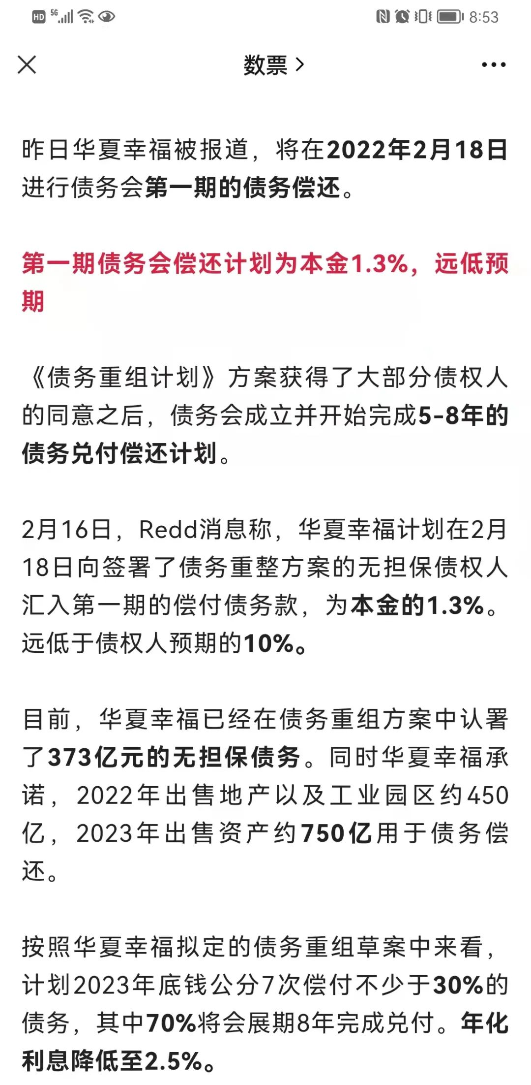 一張來自有關(guān)自媒體(數(shù)票)總結(jié)歸納的還款計劃圖,將事情本來的面貌公之于眾??赐晷畔⒅笪逦峨s陳,對于華夏幸福而言,此次債務(wù)償還十分不理想;對于金融機(jī)構(gòu)而言,這樣的還款計劃只能說聊勝于無。