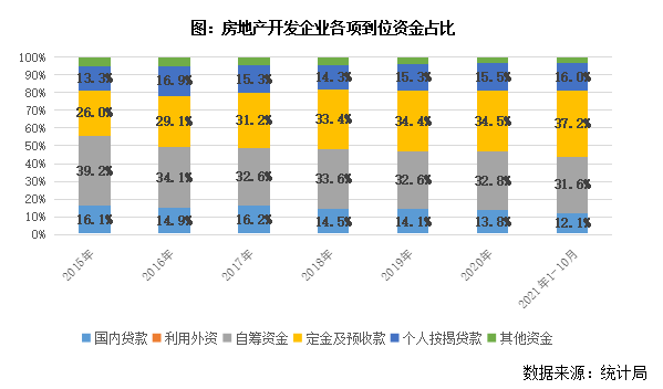 據統計局數據顯示,2021年1-10月,房地產開發企業到位資金16.7萬億元,同比增長8.8%。其中,國內貸款2萬億元,同比下降10%,占比跌至12.1%,較2020年末減少1.7個百分點。自籌資金5.3萬億元,同比增長5.1%,占比跌至31.6%,較2020年末減少1.2個百分點。定金及預收款6.2萬億元,同比增長21%,占比升至37.2%,較2020年末增加2.8個百分點。個人按揭貸款2.7萬億元,同比增長9.7%,占比升至16%,較2020年末增加0.5個百分點。說明國內貸款、自籌資金增長顯著受限,定金及預收款、個人按揭貸款漸成房企最為重要的資金渠道來源,企業對銷售回款的依賴度持續提升。