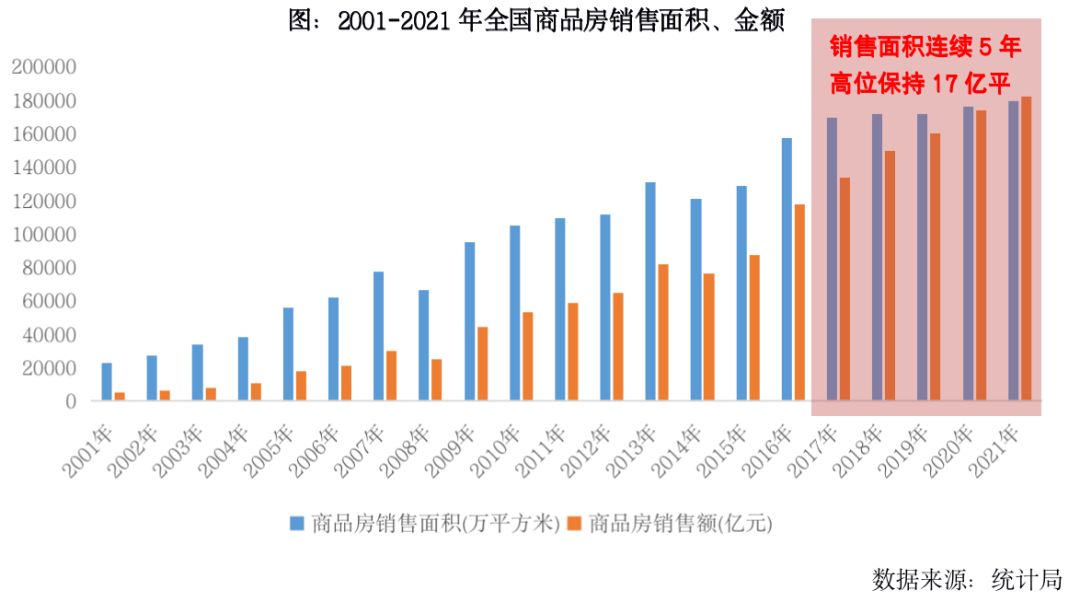 第五,住房需求趨于飽和,商品房銷售面積連續5年高位保持17億平方米。2017-2021年,全國商品房銷售面積連續5年高位保持在17億平方米。2021年,全國商品房銷售面積17.9億平方米,同比僅增長1.9%。與此同時,全國城鎮居民人均居住面積達到40平方米以上,真實反映行業規模基本見頂,未來成交規?;驅⒉饺胂陆低ǖ馈?/p>