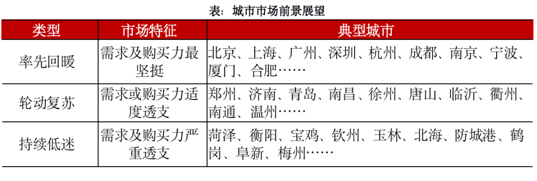 因此,我們認為隨著市場信心逐步恢復,北京、上海、杭州等核心一二線城市市場有望率先轉暖,鄭州、濟南、徐州等弱二線及強三線城市市場或將輪動復蘇?;谑袌鲂枨蠹百徺I力嚴重透支,菏澤、北海、寶雞等弱三四線城市市場或將持續低迷。