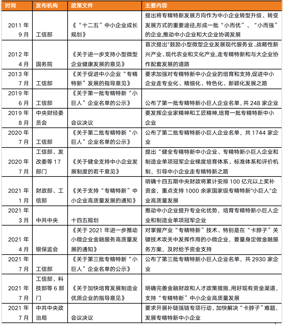 在2021年1月,財政部、工信部發布《關于支持“專精特新”中小企業高質量發展的通知》提出給與100億獎補資金支持,之后,培育專精特新“小巨人”被納入“十四五”規劃之中,銀保監會為“專精特新”中小企業量身定制金融解決方案,工信部等6部委發文支持引導中小企業走“專精特新”之路,以及中共中央政治局會議強調發展“專精特新”中小企業,至少在6個中央級重要政策、會議決議中提及“專精特新”。至此,國家政策給予的支持上升到了前所未有的高度。