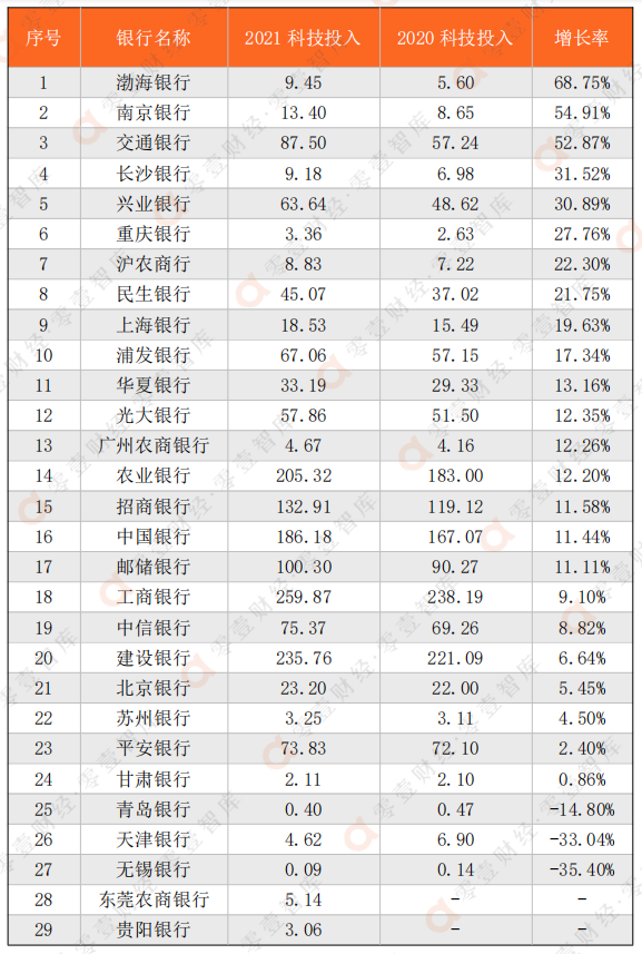 各銀行近年來積極加大科技投入,主要應(yīng)用在加快銀行的數(shù)字化、智能化轉(zhuǎn)型,提升專業(yè)化水平和服務(wù)效率、強化科技研發(fā)能力、完善風(fēng)險管理水平等方面,29家銀行的科技投入數(shù)據(jù)和排名情況如下: