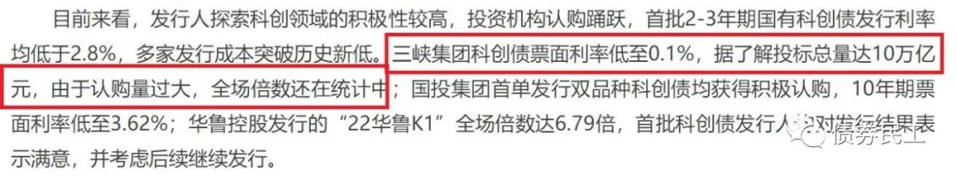 2022年5月20日,上海證券交易所印發(fā)了《上海證券交易所公司債券發(fā)行上市審核規(guī)則適用指引第4號——科技創(chuàng)新公司債券》,正式推出科技創(chuàng)新公司債券。科技創(chuàng)新公司債券推出之后,即得到了發(fā)行人和投資者的廣泛關注和認可。根據(jù)證券日報2022年5月29日的報道(http://www.zqrb.cn/stock/gupiaoyaowen/2022-05-29/A1653813408733.html),三峽集團科創(chuàng)債票面利率低至0.1%,投標總量達10萬億元!!!