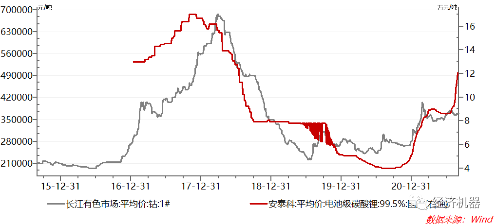 圖7、電池級碳酸鋰和鈷現(xiàn)貨價(jià)格