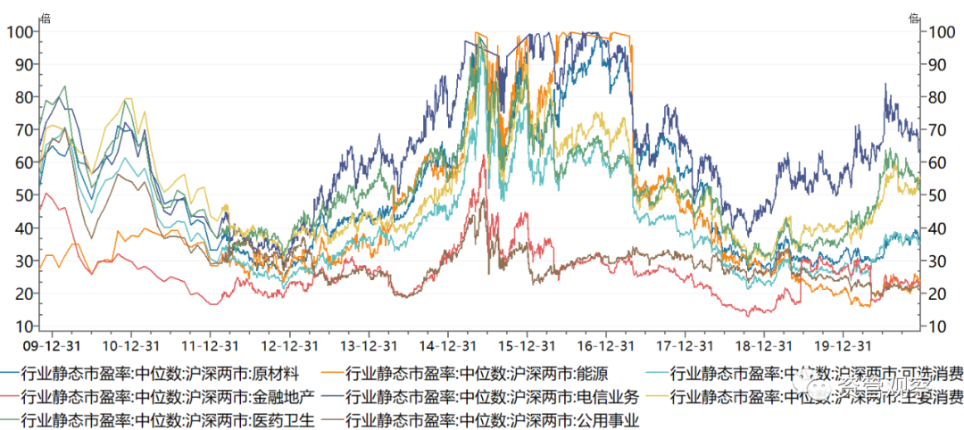 從估值角度看,2020年股市的上漲更多是估值推動(dòng),估值已上漲了18%。滬深兩市目前靜態(tài)市盈率為20.66倍,已經(jīng)接近75%分位數(shù),達(dá)到較高水平,未來(lái)估值大幅上升的空間有限。從各行業(yè)估值看,差異化非常明顯,能源、原材料、金融地產(chǎn)、可選消費(fèi)、公用事業(yè)處于相對(duì)較低的估值,而電信、醫(yī)藥、主要消費(fèi)則處于較高估值,這些領(lǐng)域的資產(chǎn)也被投資者認(rèn)為是當(dāng)前的核心資金,機(jī)構(gòu)資金抱團(tuán)現(xiàn)象較為突出。從估值角度看,2021年,部分高估值行業(yè)需要逐步自我消化,而低估值領(lǐng)域又多屬于周期行業(yè)領(lǐng)域,可能迎來(lái)估值重新定價(jià)的市場(chǎng)趨勢(shì)。