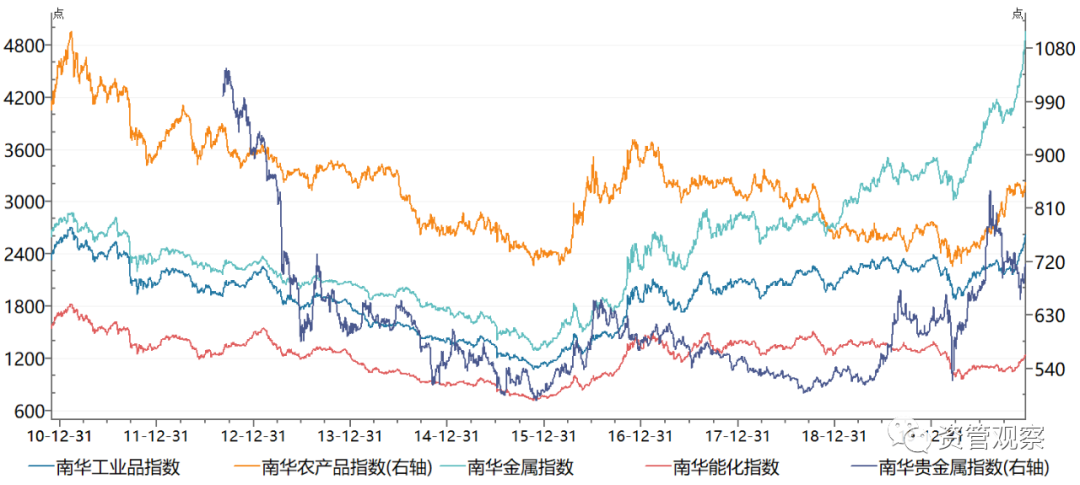 從歷史規(guī)律來(lái)看,如果比照歷史重大事件后的相似環(huán)境,可能只有2010年具有一定參考性,這主要在于2008年爆發(fā)的全球危機(jī)一致持續(xù)至2009年,在全球的努力下才獲得平息,2010年的宏觀金融走勢(shì)會(huì)與2021年具有很大相似處。一是經(jīng)濟(jì)走勢(shì)形態(tài)很相似,受到全球金融危機(jī)沖擊,2009年一季度經(jīng)濟(jì)增速處于最低點(diǎn),之后開(kāi)始復(fù)蘇,在2020年一季度達(dá)到季度最高點(diǎn),而2021年受到基數(shù)原因也有望達(dá)到近幾個(gè)季度最高點(diǎn)。二是從政策刺激方面,為應(yīng)該全球金融危機(jī),我國(guó)推出了四萬(wàn)億經(jīng)濟(jì)刺激政策,央行大幅下調(diào)存款準(zhǔn)備金率和基準(zhǔn)利率,在經(jīng)濟(jì)復(fù)蘇后,2010年刺激政策逐步退出,這個(gè)政策節(jié)奏與今年和明年的走勢(shì)也較為相似。三是從通脹看,尤其是PPI方面,這兩個(gè)年份都是在前一年受到需求沖擊后,2010年實(shí)現(xiàn)了PPI的大幅度增長(zhǎng),當(dāng)前PPI已經(jīng)出現(xiàn)向上拐點(diǎn),明年P(guān)PI有望持續(xù)走高。當(dāng)然,越需要看到兩個(gè)年份有所差距在于,所處經(jīng)濟(jì)周期以及政策實(shí)施形式都有一定差異之處,但是這可能只影響金融市場(chǎng)波動(dòng)幅度,對(duì)于金融市場(chǎng)方向仍可有很高的參考性。那么2010年,大宗商品表現(xiàn)最好,南華綜合指數(shù)收益率為12.04%,債券總指數(shù)收益率為1.92%,而萬(wàn)得全A指數(shù)收益率為-6.88%,整體來(lái)看風(fēng)險(xiǎn)資產(chǎn)內(nèi)部表現(xiàn)出現(xiàn)了較為明顯的分化。