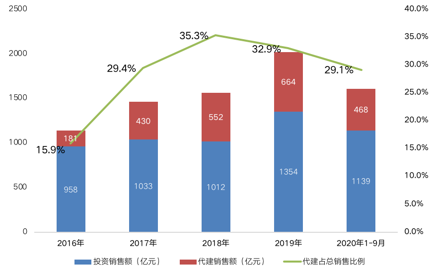 綠城代建每年可為企業(yè)貢獻(xiàn)30%左右的銷售額,還可幫助企業(yè)提升品牌、輸出物業(yè)管理業(yè)務(wù)。綠城目前已將旗下的綠城管理成功打造上市,根據(jù)綠城中國(guó)披露的業(yè)績(jī)公告,2020年1-9月企業(yè)共實(shí)現(xiàn)銷售額1961億元,其中代建貢獻(xiàn)了560億元的銷售,占企業(yè)總銷售額的比例為29%。