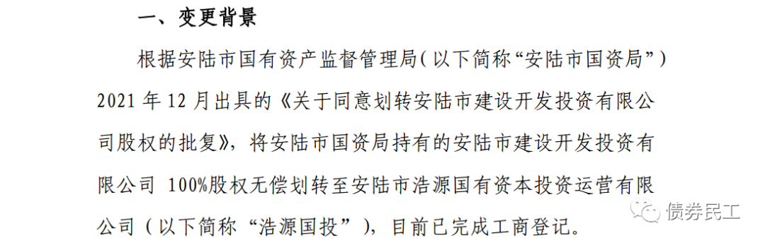9、根據安陸市建設開發投資有限公司(主體信用等級AA-)2022年1月13日的公告,將安陸市國資局持有的100%股權無償劃轉至安陸市浩源國有資本投資運營有限公司。安陸市浩源國有資本投資運營有限公司未發行過債券。