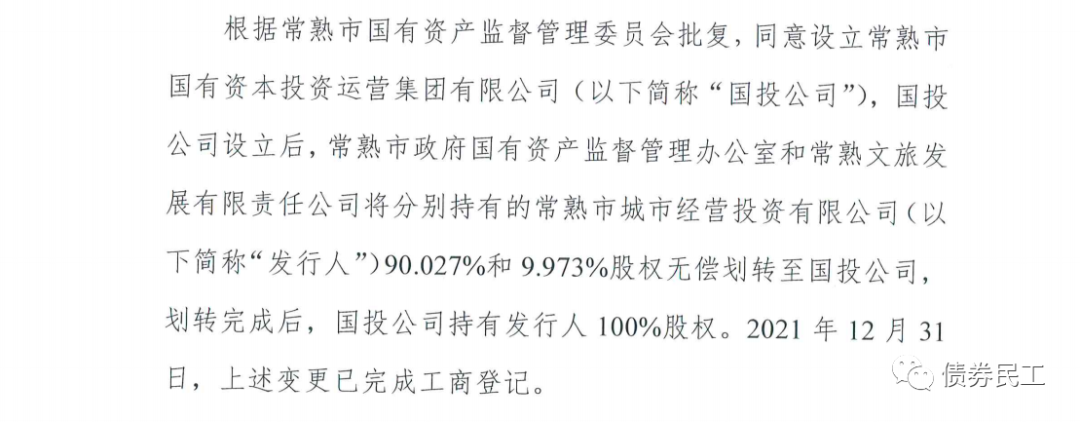 12、根據常熟市城市經營投資有限公司(主體信用等級AA+)2022年1月4日的公告,公司的股東變更為常熟市國有資本投資運營集團有限公司。常熟市國有資本投資運營集團有限公司未發行過債券。