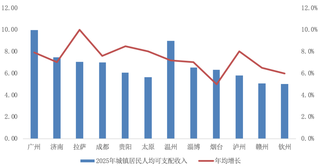 “十四五”期間,居民收入仍保持平穩增長態勢,并與經濟增長基本同步。2025年,濟南、拉薩、成都等二線城市城鎮居民人均可支配收入將達到7萬元以上,廣州更將達到9.99萬元,年均增長7.9%。淄博、煙臺、瀘州等三四線城市城鎮居民人均可支配收入將升至6萬元附近,溫州更將升至8.97萬元,年均增長7.2%。