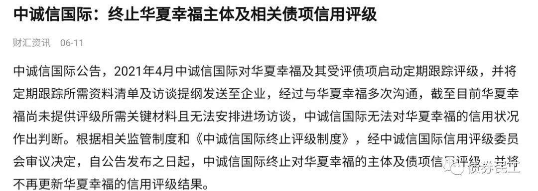 根據(jù)財(cái)匯資訊2021年6月11日的報(bào)道,因華夏幸福尚未提供評(píng)級(jí)所需要的關(guān)鍵材料且無法安排進(jìn)場訪談,中誠信決定終止對(duì)華夏幸福的主體及債項(xiàng)評(píng)級(jí)。