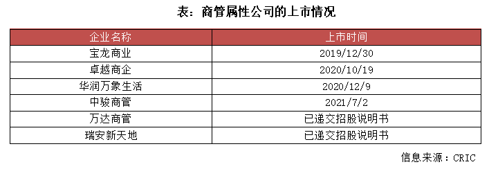 今年以來,商管賽道布局呈現明顯的加速跡象。一方面,商管屬性公司相繼布局上市。繼1月26日,星河控股旗下商業運營及管理公司星盛商業在港成功上市,7月2日中駿商管也掛牌上市,中駿商管是中駿集團旗下以商業物業管理服務為主導的服務提供商,凸顯“商管”定位。截至目前,商管屬性上市公司共有4家,此外瑞安新天地、萬達商管也相繼遞交招股說明書,加速推進上市進程。