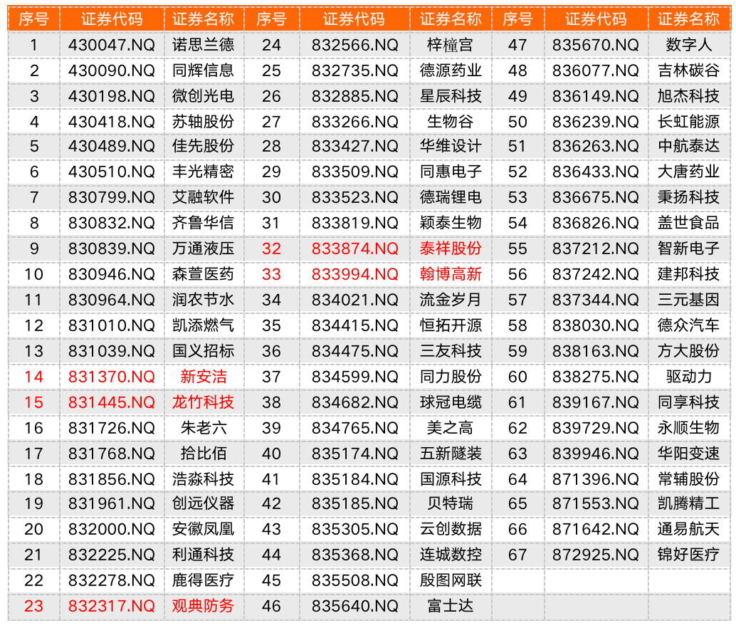 新三板自2016年起開設分層管理,2019年進行新一輪改革,目前被劃分為“基礎(chǔ)層”、“創(chuàng)新層”和“精選層”。截至10月25日,據(jù)“全國中小企業(yè)股份轉(zhuǎn)讓系統(tǒng)”數(shù)據(jù)顯示,新三板掛牌公司總數(shù)達到7243家,其中基礎(chǔ)層5931家、創(chuàng)新層1245家、精選層67家。而北交所的設立主要是由精選層變更而來,精選層的掛牌公司也將平移至北交所,換言之這67家精選層企業(yè)也將成為北交所第一批上市公司。