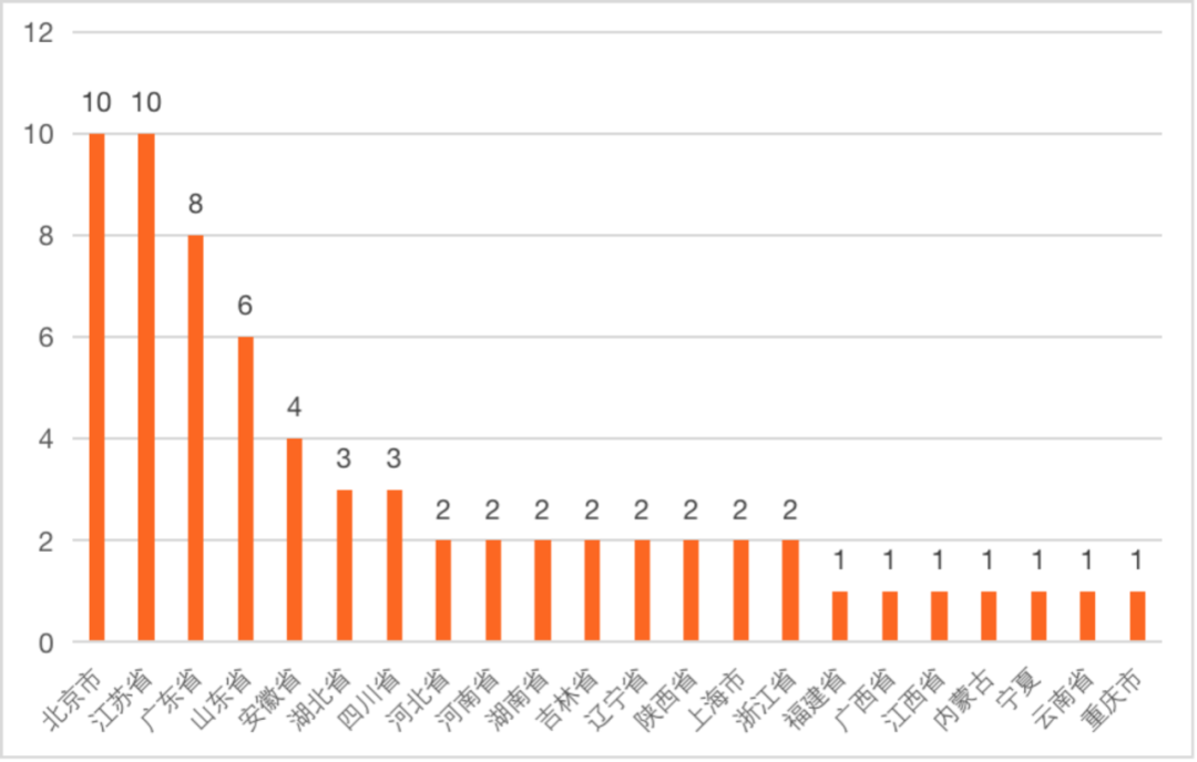 從省份層面來看,北京市和江蘇省以10家掛牌企業(yè)數(shù)雙雙位列第一,北京作為北交所成立之后的主陣地,可以預見的是北京企業(yè)后續(xù)將充分發(fā)揮地區(qū)優(yōu)勢。