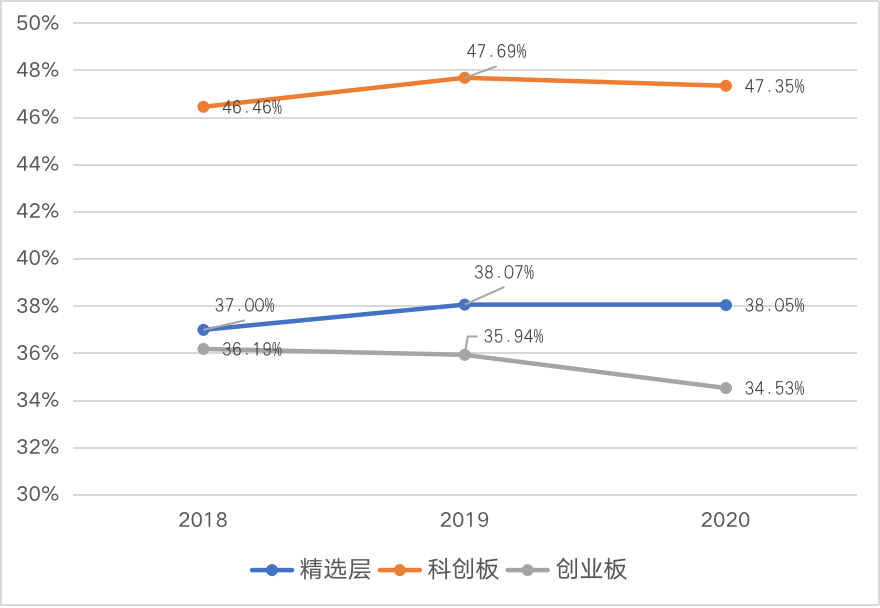 從毛利率情況來看,2018年至2020 年精選層掛牌企業(yè)平均毛利率分別為37%、38.07%、38.05%,雖不及科創(chuàng)板普遍超過45%的高毛利水平,但相比創(chuàng)業(yè)板36.19%、35.94%、34.53%的毛利率均實現(xiàn)趕超,并有進一步擴大之勢。