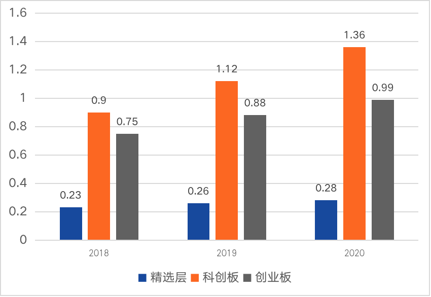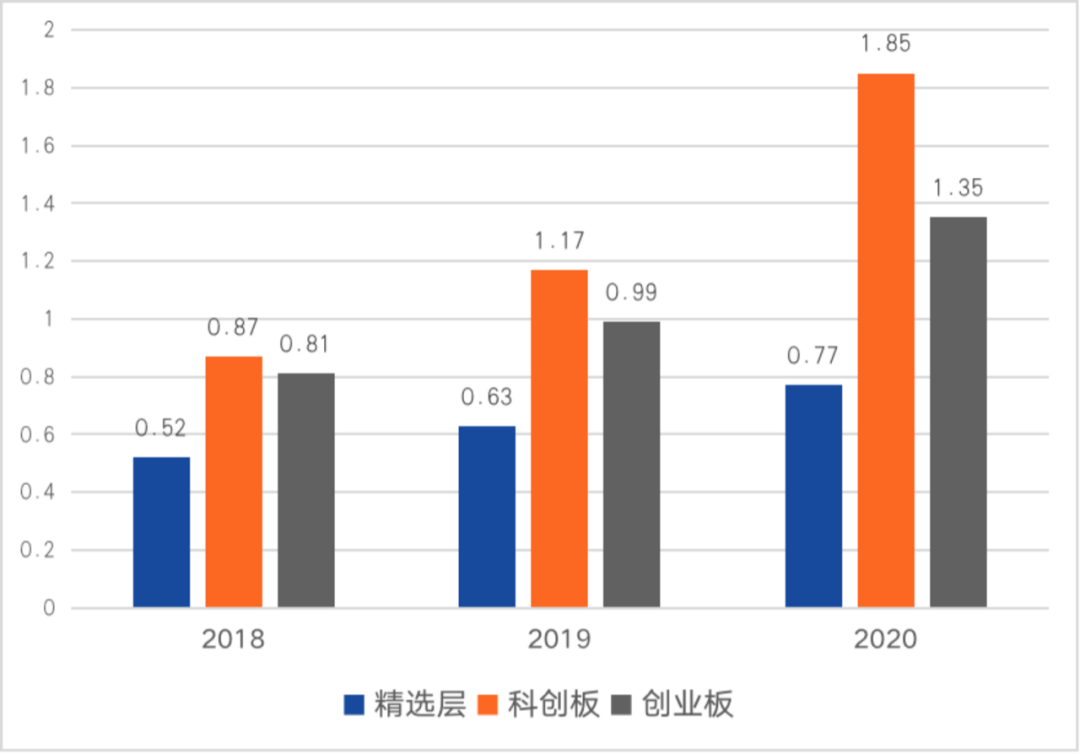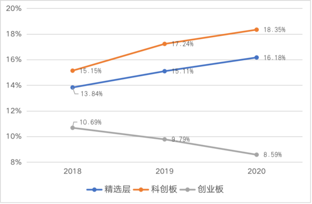 在銷售凈利率方面,精選層2018年至2020 年平均值分別為13.84%、15.11%、18.35%,精選層企業(yè)整體與科創(chuàng)板歷年凈利率水平穩(wěn)定在2pct的差距,但遠高于創(chuàng)業(yè)板水平,在2020年比創(chuàng)業(yè)板高出了近8pct。