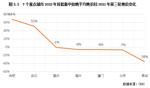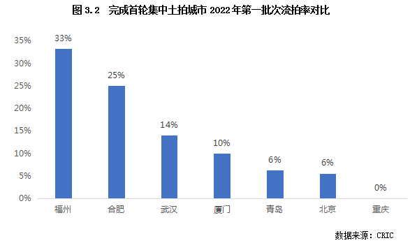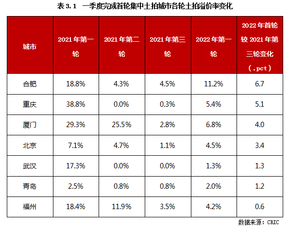 受季節性和疫情因素的影響,一季度重點城市集中土拍進度相對滯緩,僅有北京、福州、合肥、廈門、青島、重慶和武漢7個城市完成首輪集中土拍(上海和成都僅少量地塊在季度末成交),新階段下土地市場的特征和走向逐漸顯現。本節將從一季度完成首批集中拍地的重點城市的市場熱度、地價水平、盈利空間變化等多角度進行系統剖析,以期為房企接下來的拿地決策提供參考性建議。