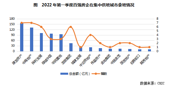 從企業投資角度來看,由于2021年較為嚴格的金融監管政策帶來的現金流壓力仍在,大部分房企在今年一季度仍未恢復投資力度,8個熱點城市的集中供地中百強房企拿地金額占比約為一半,其中建發、中海、保利等少數房企表現較為突出,布局范圍也相對較大。