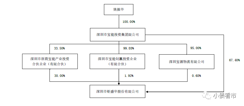 從股權(quán)結(jié)構(gòu)看,鉅盛華的控股股東為寶能投資集團(tuán),持股比例為67.4%,公司實(shí)際控制人為姚振華。