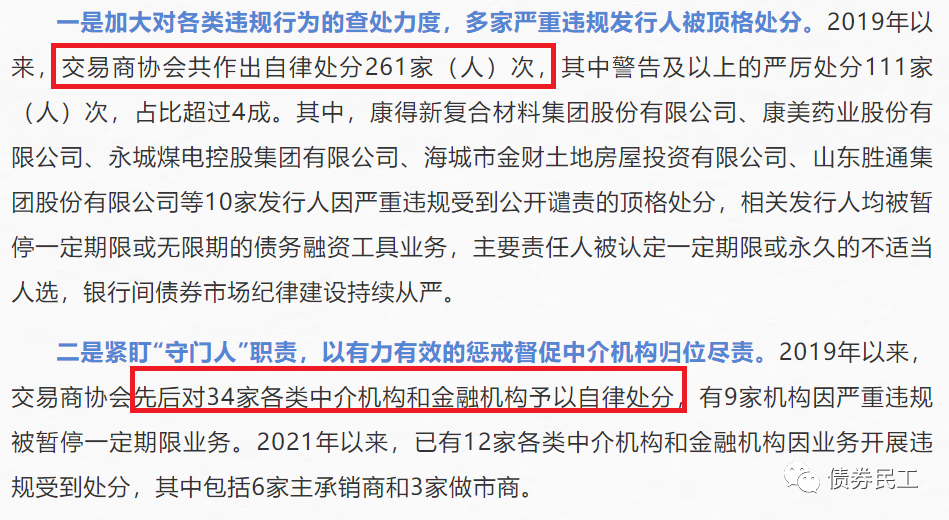 2021年9月22日,交易商協會通過官方公眾號刊發了《聚焦銀行間債券市場提質增效 嚴肅查處懲戒各類違規行為》的文章,介紹2019年以來交易商協會累計對發行人共作出自律處分261家(人)次,對34家各類中介機構和金融機構予以自律處分。