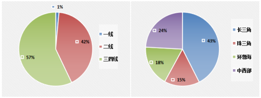 區域分布上來看,由于長三角二線城市供應增加,1月份百強拿地中43%位于長三角,其次24%位于中西部,環渤海和珠三角占比相對較低,分別為18%和15%。