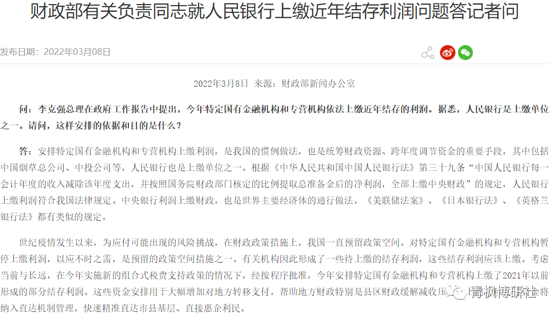 (一)政府工作報告和財政預算報告均明確今年的財政支出擴大主要得益于特定國有金融機構和專營機構上繳的結存利潤實現。這就意味著,央行是屬于特定國有金融機構和專營機構的,這個應沒有異議。