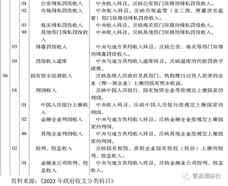 2021年10月18日,財政部發布的《2022年政府收支分類科目》對央行、金融企業及其它企業上繳利潤情況單列了科目,將其歸為“國有資本經營收入——利潤收入”之塊,即國有資本經營收入的利潤收入部分包括中國人民銀行上繳收入、金融企業利潤收和其他企業利潤三大塊。
