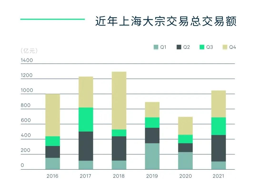據(jù)世邦魏理仕數(shù)據(jù)顯示,2021年上海大宗交易市場共錄得交易89筆,全年交易總額重返千億量級,達(dá)人民幣1,044.3億元,同比上漲51.3%。