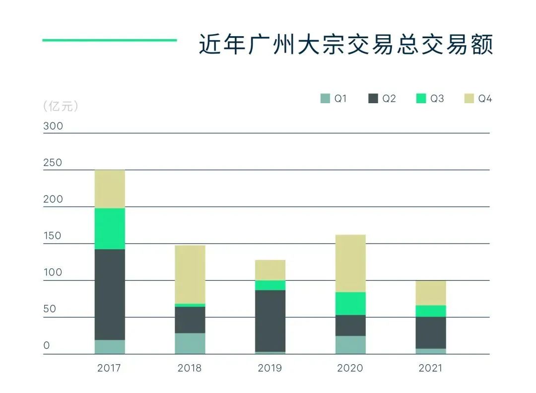 據(jù)世邦魏理仕數(shù)據(jù)顯示,2021年廣州錄得交易14宗,總成交金額約為102億元人民幣(未統(tǒng)計關(guān)聯(lián)交易),同比減少38%。