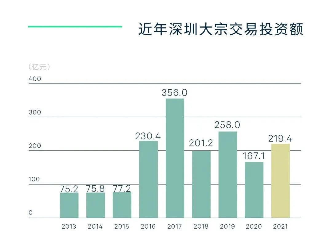 據(jù)世邦魏理仕數(shù)據(jù)顯示,2021年深圳大宗交易市場全年共錄得23宗交易,整體成交金額共計219.4億元,同比上升31.0%。