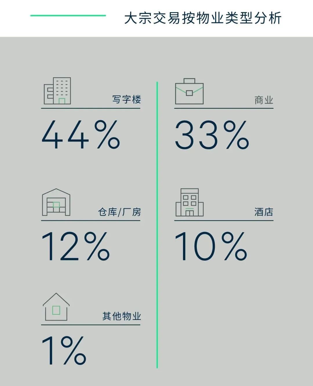 工業(yè)物業(yè)成交錄得大幅提升,占比15%,尤其是錄得多筆物流資產(chǎn)包交易。受益于在線新經(jīng)濟而加速發(fā)展的數(shù)據(jù)中心連續(xù)三個季度錄得成交。