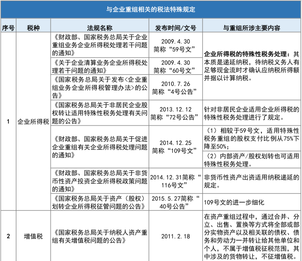 根據(jù)《財政部、國家稅務總局關(guān)于企業(yè)重組業(yè)務企業(yè)所得稅處理若干問題的通知》(財稅[2009]59號,以下簡稱“59號文”)的定義,企業(yè)重組是指企業(yè)在日常經(jīng)營活動以外發(fā)生的法律結(jié)構(gòu)或經(jīng)濟結(jié)構(gòu)重大改變的交易,包括企業(yè)法律形式改變、債務重組、股權(quán)收購、資產(chǎn)收購、合并、分立等。在企業(yè)重組過程中,通常會涉及企業(yè)所得稅、個人所得稅、印花稅、增值稅、契稅、土增稅等稅種,在確保合規(guī)前提下進行稅收成本控制,符合重組各方的利益訴求,對重組方案的最終達成具有重要作用。