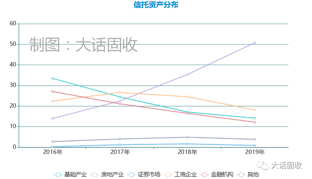2016年之前,基建類信托是萬向信托的主流業(yè)務(wù),后面就持續(xù)走低,到2019年占比不到15%;而“異軍突起”的房地產(chǎn)業(yè)務(wù),從2017年起,四年期間從13%上升到了50%+!