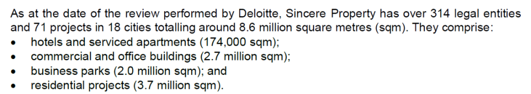 殊不知,協信遠創的資產結構非常重,根據事后CDL委派德勤會計師事務所對協信遠創的全面審計,協信在全國18個城市的71個項目,總計還有860萬平米的可售或自持面積,其中住宅只有360萬平米,不到45%,其余為酒店或服務式公寓、商場、寫字樓以及科技園區等。