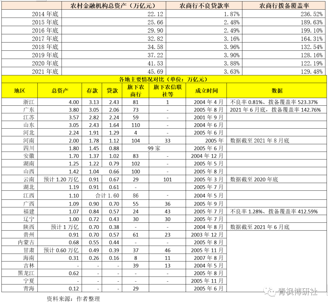 農商行一定程度上能夠代表各地省聯社體系的質量。截至2021年底,農商行的不良貸款率和撥備覆蓋率分別為3.63%和129.48%,資產質量整體比較堪憂。但是從公布資產質量的部分地區來看,分化較為明顯。