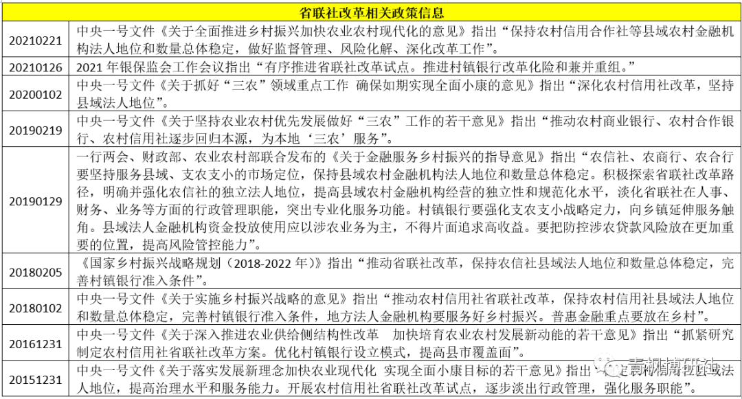 (1)2021年10月21日,銀保監會首席檢查官、辦公廳主任王朝弟在國新辦發布會上表示“繼續深化農信社改革已經提上日程……把深化省聯社改革與提高農信系統風險防控能力作為重點,因地制宜,按照‘一省一策’的原則,支持各?。▍^)從自身實際出發,制定切實可行的農信社改革方案……通過改革,能夠切實讓省聯社成為一個產權清晰、權責明確、政企分開、管理規范的現代化金融企業”,同時在該發布會上,王朝弟還透露絕大部分省份已經上報了深化農信社改革方案,且浙江省的農信社改革方案即將落地。
