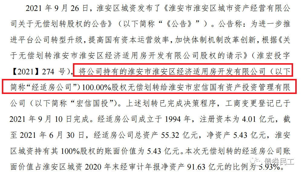 1、淮安市淮安區(qū)城市資產(chǎn)經(jīng)營有限公司公告,將公司持有的淮安市淮安區(qū)經(jīng)濟(jì)適用房開發(fā)有限公司的股權(quán)無償劃轉(zhuǎn)給淮安市宏信國有資產(chǎn)投資管理有限公司(控股股東為淮安區(qū)人民政府)。