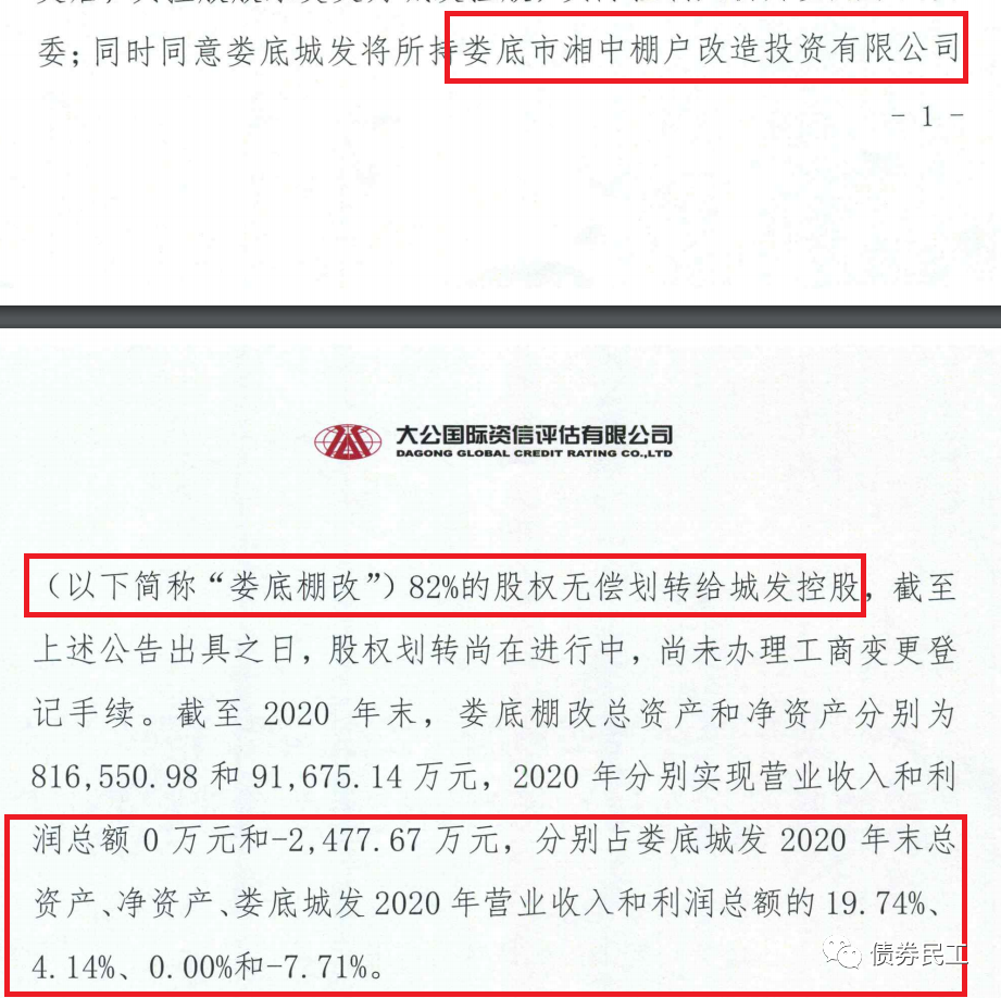 4、婁底市城市發(fā)展集團(tuán)有限公司(主體信用評級為AA)公告,將公司持有的婁底市湘中棚戶區(qū)改造投資有限公司82%的股權(quán)無償劃轉(zhuǎn)給婁底市城市發(fā)展控股集團(tuán)有限公司(控股股東為婁底市國資委)。