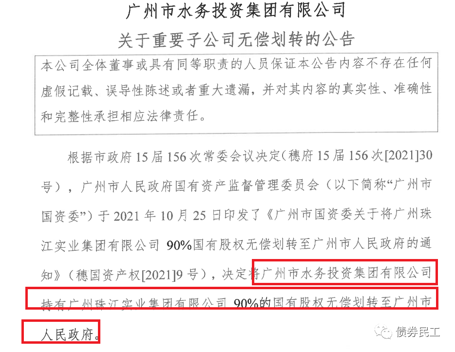 3、廣州市水務(wù)投資集團(tuán)有限公司(主體信用評級為AAA)公告,將公司持有的廣州珠江實業(yè)集團(tuán)有限公司90%的股權(quán)無償劃轉(zhuǎn)給廣州市人民政府。此次劃轉(zhuǎn)完成之后,公司不再持有廣州珠江實業(yè)集團(tuán)有限公司的股權(quán)。