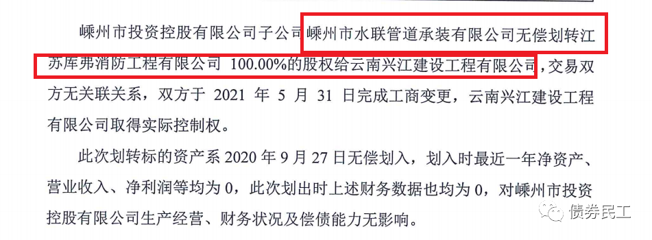 6、嵊州市投資控股有限公司(主體信用評級為AA+)公告,將子公司持有的江蘇庫弗消防工程有限公司100%的股權(quán)無償劃轉(zhuǎn)給云南興江建設(shè)工程有限公司(實際控制人為自然人)。不過該劃出的子公司凈資產(chǎn)、營業(yè)收入和凈利潤均為0。